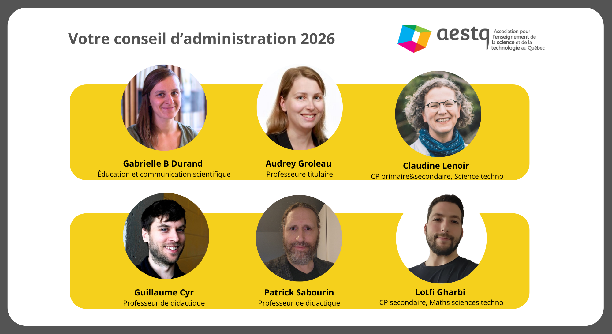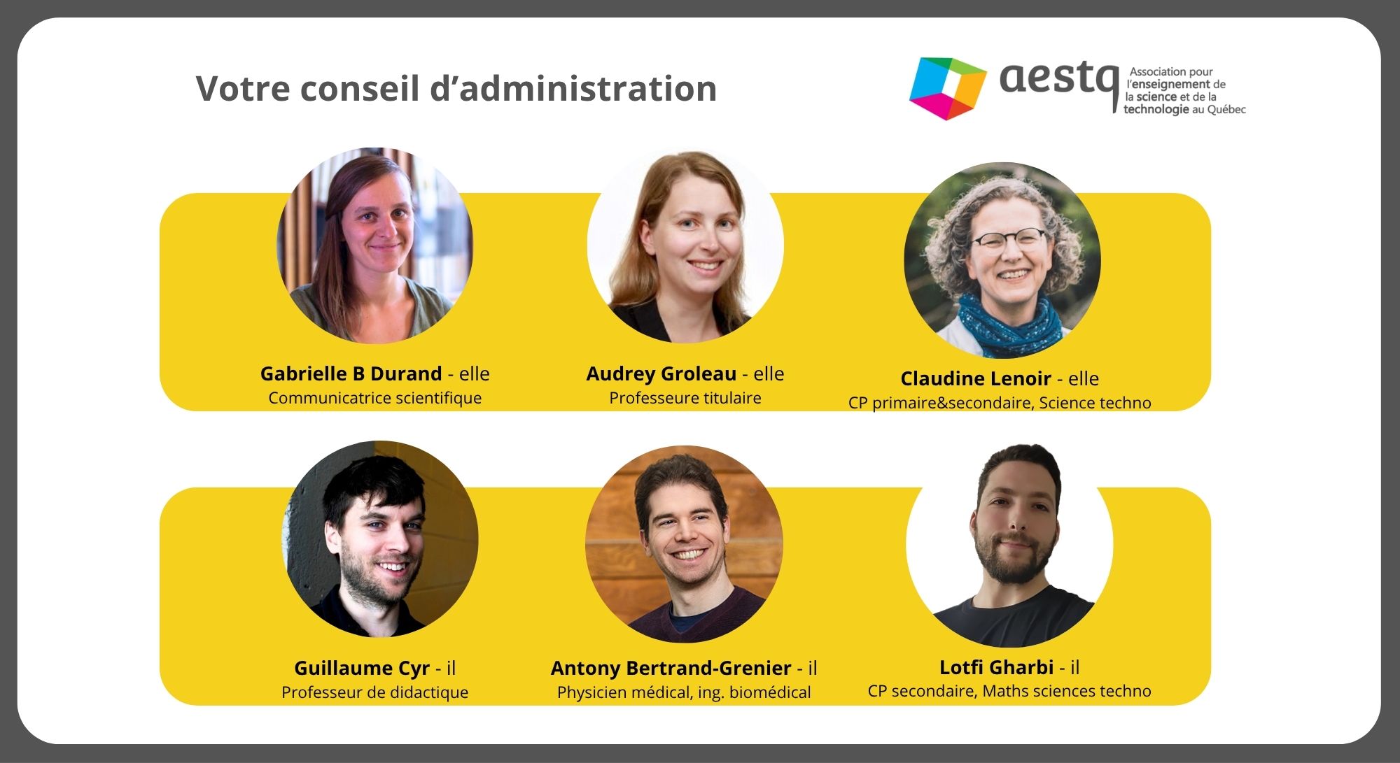 L’AESTQ est heureuse de pouvoir compter sur l’implication bénévole des membres de son Conseil d’administration. Étant donné le changement important qu'est la perte de la permanence, le conseil d'administration de l'AESTQ ne compte exceptionnement pas d'enseigant·e au secondaire pour le moment. Le conseil en place actuellement en est un de crise, qui guidera les changements dans l'offre aux membres dans le contexte changeant de l'enseignement des sciences et des technologies au Québec. Ce sont ces personnes qui orientent les visées et les actions de l’AESTQ en respect de sa mission.